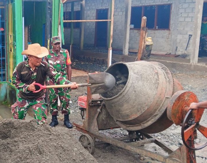 Papua, SemeruPost – Babinsa Koramil 1710-07 Mapurujaya dipimpin Pelda Puryanto bersama warga melaksanakan gotong royong kerja bakti pengecoran, lantai gedung Sekolah TK Al-Ma’rifat Kel. Wania, Distrik Mimika Timur, Kab. Mimika, Selasa (21/05/2024).