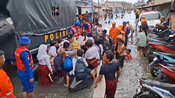 Jakarta, SemeruPost – Bhabinkamtibmas Muara Angke Polsek Kawasan Sunda Kelapa Polres Pelabuhan Tanjung Priok dan Ditpolairud Polda Metro Jaya serta Badan Penanggulangan Bencana Daerah (BPBD) membantu anak-anak sekolah yang akan berangkat ke sekolah dengan menyeberangkan di lokasi banjir rob di jalan Pelabuhan Muara Angke. Petugas pun mengangkat anak-anak berseragam sekolah untuk mengarungi banjir rob, yang arusnya cukup lumayan deras. Ketinggian air di badan jalan mencapai 40 sentimeter. Salah satu petugas kepolisian yang membantu anak-anak sekolah, yakni Bhabinkamtibmas Muara Angke Polsek Kawasan Sunda Kelapa Polres Pelabuhan Tanjung Priok, Aiptu Setiyono.