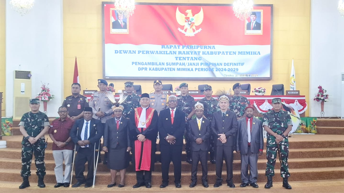 Timika, SemeruPost – Komandan Kodim 1710/Mimika, Letkol Inf M. Slamet Wijaya, S.Sos., M.Han., M.A. menghadiri Rapat Paripurna dalam rangka pengambilan sumpah/janji Pimpinan Definitif DPRK Mimika periode 2024-2029, yang berlangsung di Ruang Rapat Paripurna DPRD Mimika, Jl. Cendrawasih, Kamis (27/3/2025).