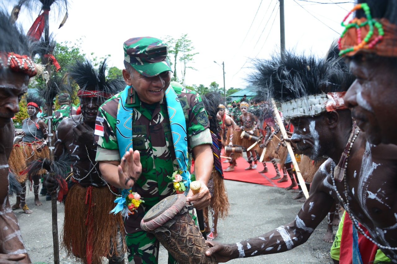 Setibanya di Makodim 1710/Mimika, Danrem 174/ATW Brigjen TNI Bangun Nawoko beserta Ny. Renny Bangun Nawoko disambut tarian adat Suku Kamoro yang diiringi oleh Prajurit dan Persit Kodim 1710/Mimika serta jajar kehormatan.