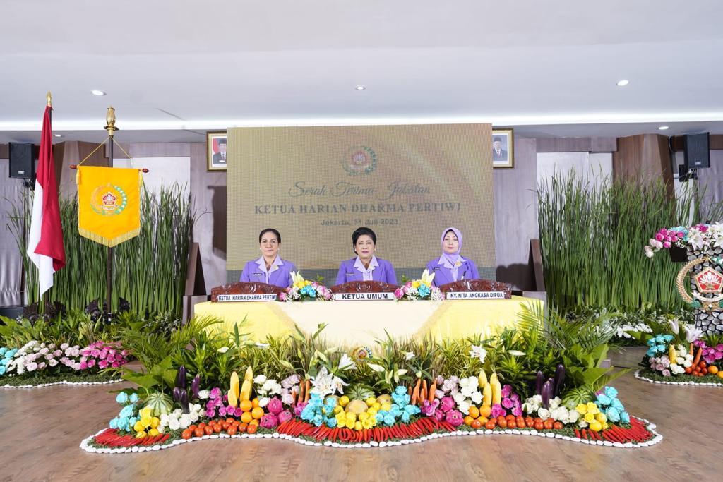 “Selamat datang dan bertugas bergabung di organisasi pengurus Dharma Pertiwi, Pengurus Pusat tentunya, kepada Ny. Nita Angkasa Dipua sebagai Ketua Harian Dharma Pertiwi, marilah diberikan dukungan bantuan dan kerja sama untuk meneruskan tugas mulia ini,” ucap Ketum Dharma Pertiwi.