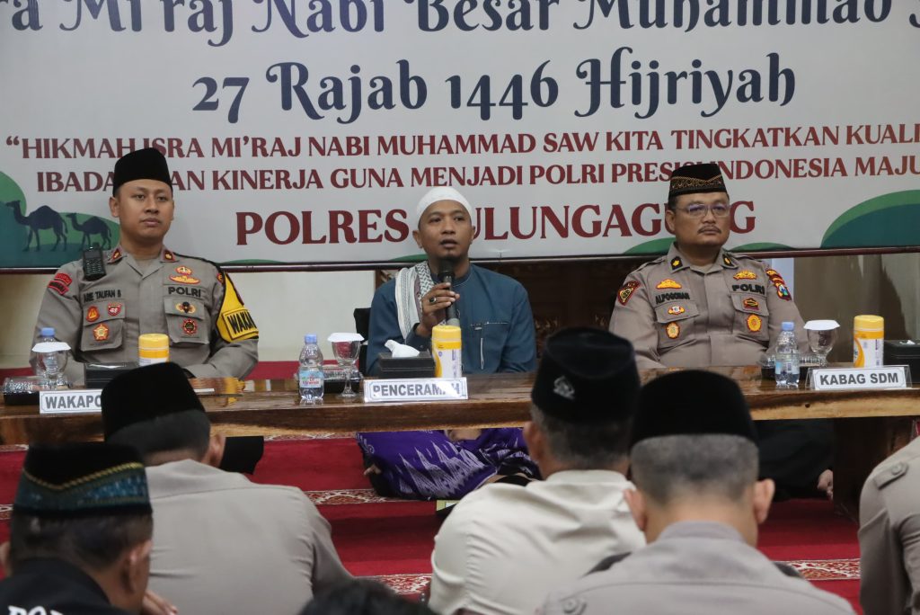 SemeruPost,Tulungagung-Dalam rangka meneladani kehidupan Nabi Muhammad SAW anggota Polri dan PNS Polri Polres Tulungagung menggelar acara peringatan isra mikraj Nabi Muhammad SAW 1446 H / 2025 yang dihadiri oleh seluruh anggota Polres Tulungagung serta Pengurus Bhayangkari Cabang Tulungagung dan diikuti Polsek jajaran melalui virtual.
