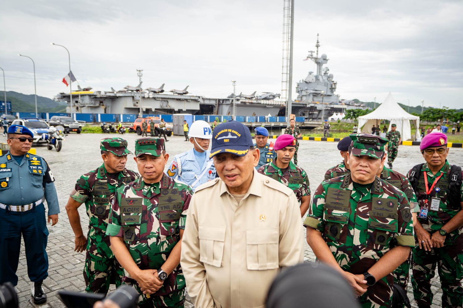 Lombok, SemeruPost – Panglima TNI Jenderal TNI Agus Subiyanto bersama Kepala Staf Angkatan Laut (Kasal) Laksamana TNI Muhammad Ali mendampingi Menteri Pertahanan RI Sjafrie Sjamsoeddin dalam peninjauan Kapal Induk Prancis Charles De Gaulle (R91) di Pelabuhan Gili Mas, Labuan Tereng, Kecamatan Lembar, Kabupaten Lombok Barat, Nusa Tenggara Barat, Sabtu (01/02/2025).