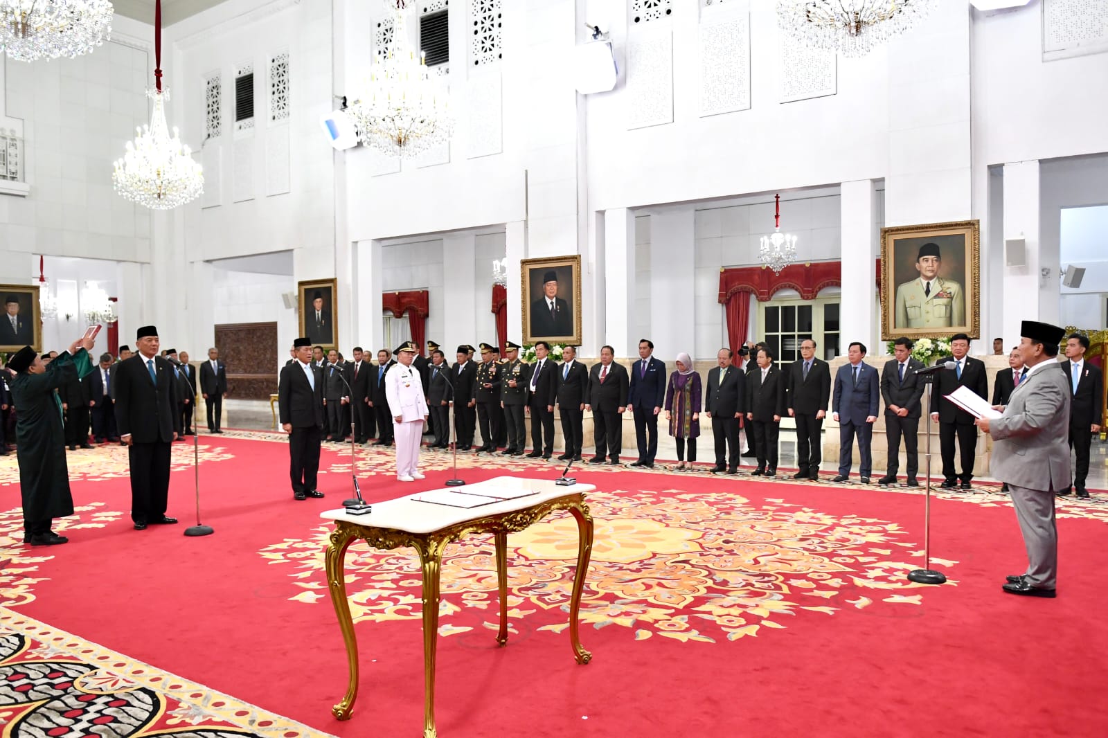 Turut hadir pada acara tersebut di antaranya, Wakil Presiden RI Gibran Rakabuming Raka, Menteri Koordinator Bidang Hukum, HAM, Imigrasi, dan Pemasyarakatan Yusril Ihza Mahendra, Menteri Hukum Supratman Andi Agtas, Menteri Koordinator Bidang Politik dan Keamanan Budi Gunawan, Menteri Dalam Negeri Tito Karnavian, Kapolri Jenderal Listyo Sigit Prabowo dan Wakil Ketua DPR RI Sufmi Dasco Ahmad. (Foto: BPMI Setpres)