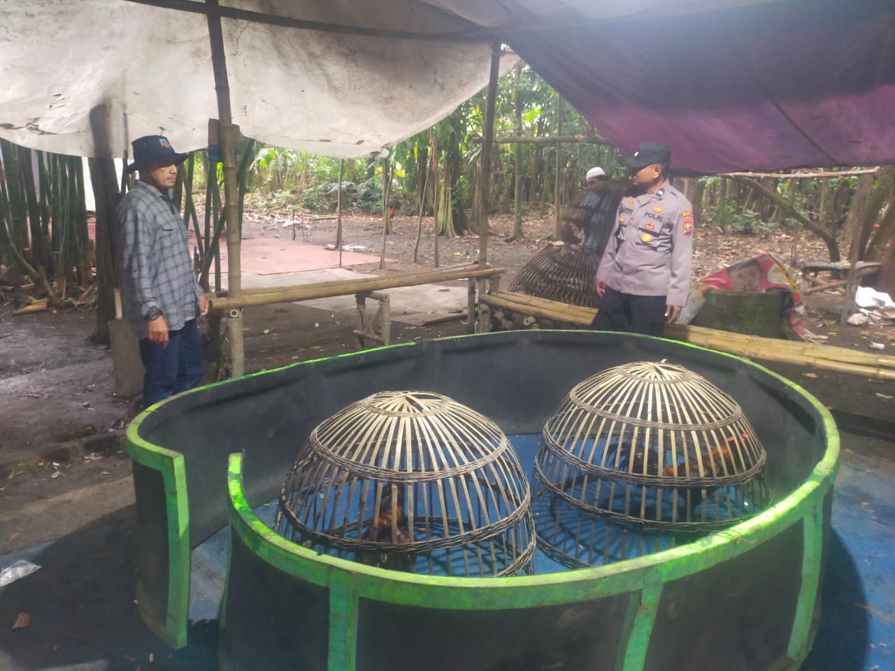 Anggota Reskrim yang dipimpin langsung oleh Kapolsek Tarik,AKP Heri Setiawan bersama Kanit Reskrim serta beberapa anggota Intel Samapta serta dari Koramil Tarik mengumpulkan barang bukti seperti 2 ekor ayam jantan, 2 sepeda motor,2 kurungan ayam.