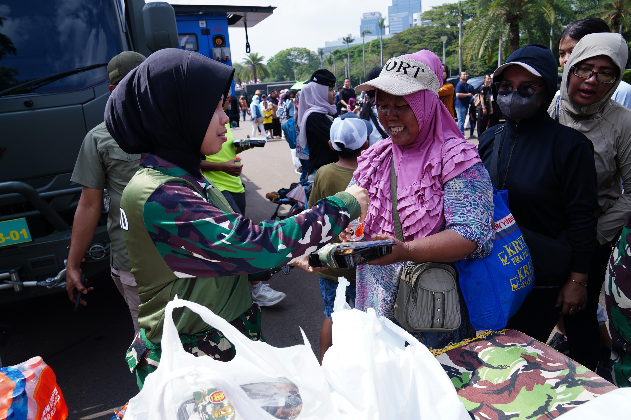 Deretan tenda UMKM menyajikan aneka makanan, berpadu dengan aroma masakan hangat yang dimasak langsung oleh prajurit TNI di dapur lapangan. Kehangatan tersebut bukan hanya hadir dari makanan, tetapi juga dari interaksi antara masyarakat dan prajurit yang ikut melayani pembagian.