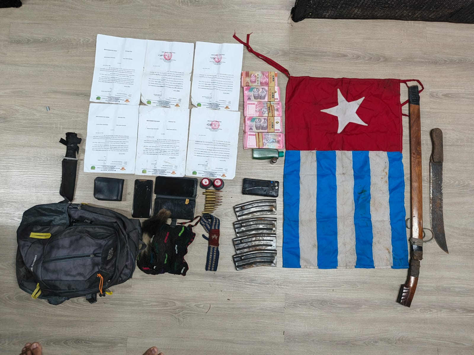 Sementara dari Kampung Gunalu, ditemukan uang tunai puluhan juta rupiah, empat magazen, munisi kaliber 7,62 mm dan 5,56 mm, bendera Bintang Kejora, cap stempel TPNPB, dokumen berisi permintaan dana, serta berbagai perlengkapan komunikasi dan logistik. Temuan uang tunai dan dokumen tersebut memperkuat dugaan adanya aliran dana ilegal baik melalui permintaan paksa kepada aparat pemerintah maupun perampasan terhadap masyarakat untuk mendukung aktivitas kelompok separatis di wilayah pegunungan tengah Papua.