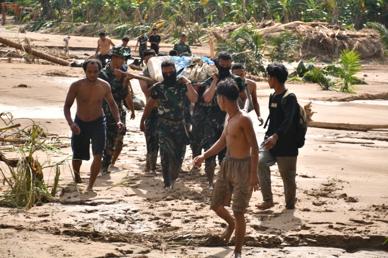 Proses evakuasi dilakukan di tengah kondisi medan yang menantang, dengan banyaknya material kayu, lumpur, serta akses yang terputus. Mengedepankan kemanusiaan dan kecepatan penanganan, prajurit TNI bersama masyarakat sekitar bergotong-royong mengevakuasi jenazah ke titik aman sebelum diserahkan kepada pihak keluarga.