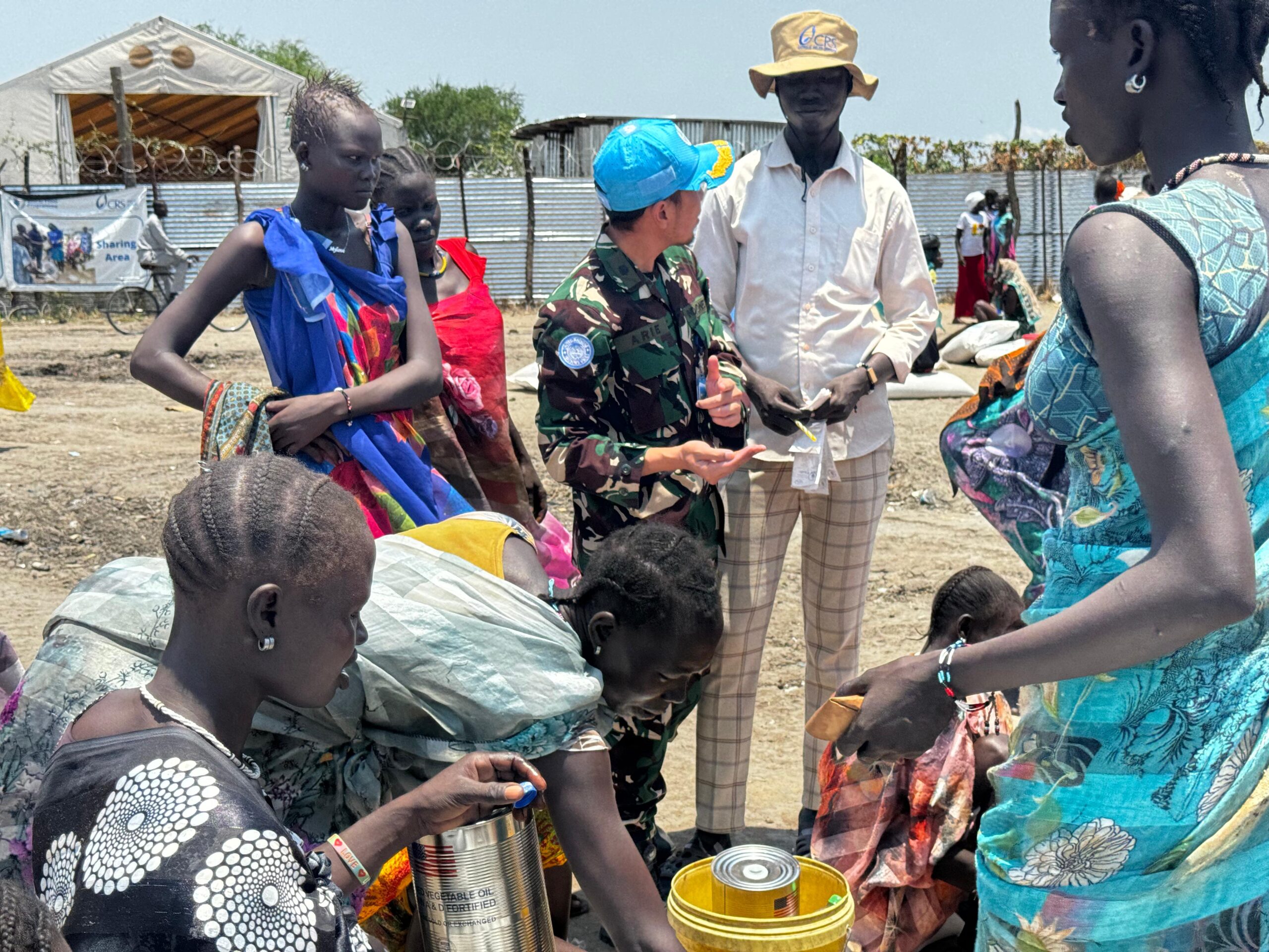 Satgas Military Observers (Milobs) United Nations Mission In South Sudan (UNMISS) memberikan bantuan kemanusiaan berupa bahan makanan