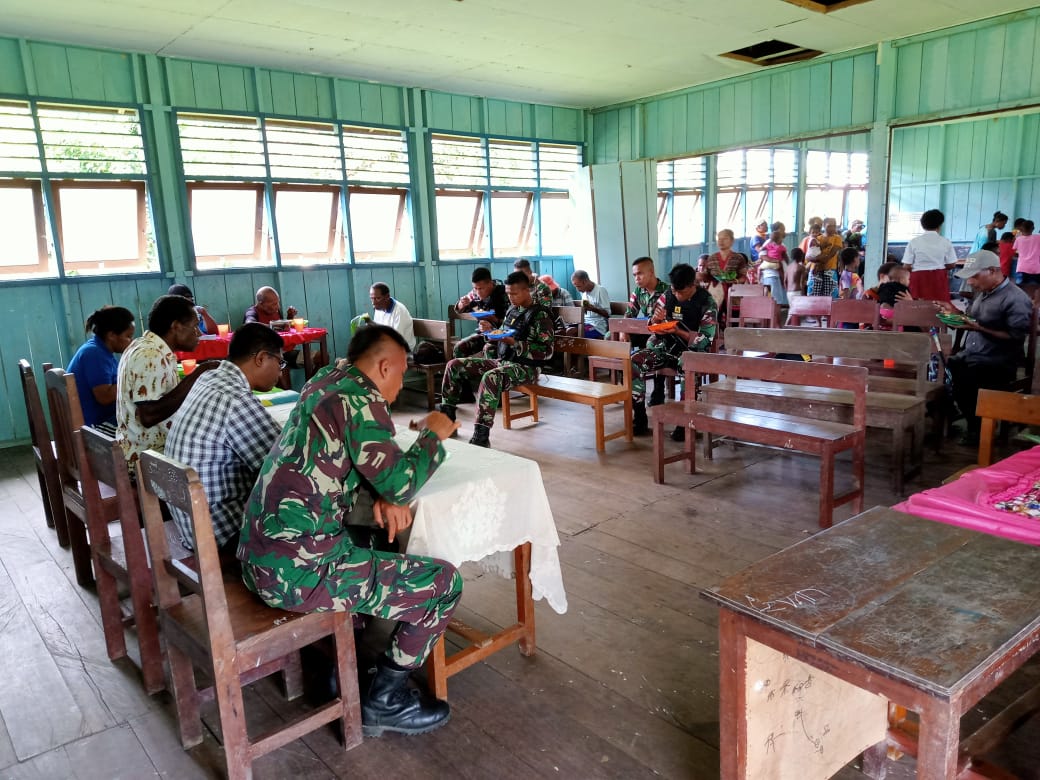 Keerom, SemeruPost – Pererat hubungan dan tali persaudaraan bersama masyarakat perbatasan, Satgas Yonif 126/Kala Cakti Pos Yuruf menggelar makan bersama warga Kampung Yuruf, Distrik Yaffi, Kabupaten Keerom.